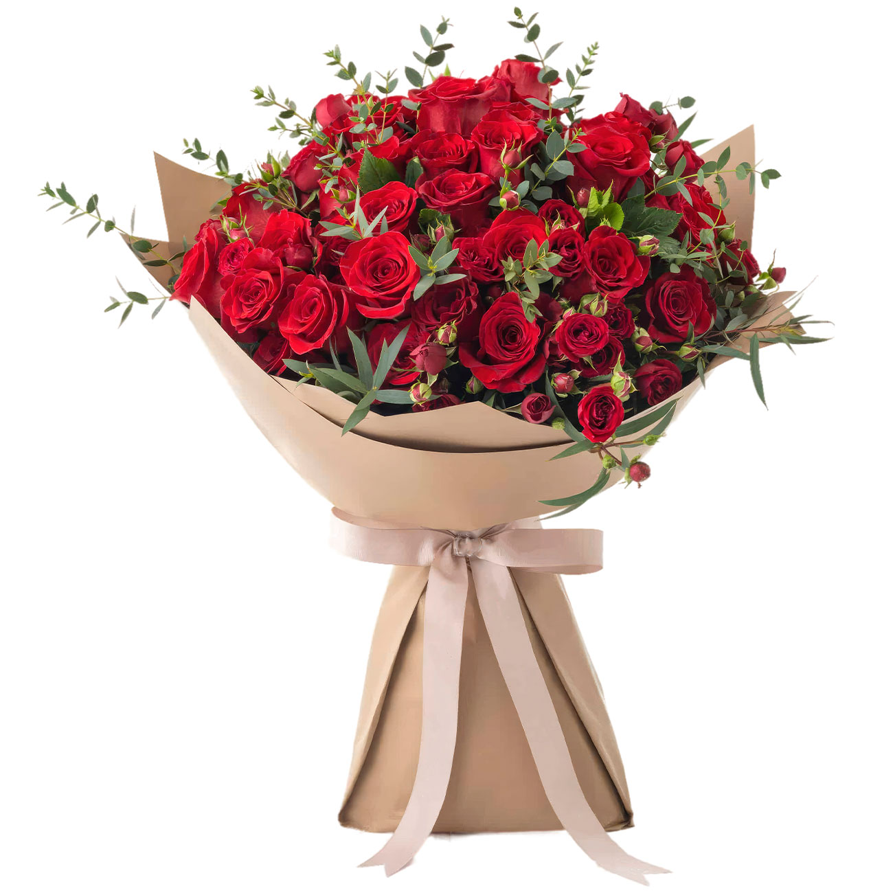 Роза красная кенийская, эвкалипт. Упаковка (лента, пленка, крафт, сетка, пленка матовая)