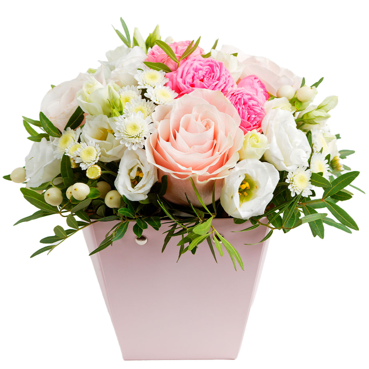 Роза одноголовая розовая, роза кустовая розовая, эустома белая, хризантема кустовая белая, гиперикум, фисташка. Упаковка (шляпная коробка, квадратный бокс, коробка сердце, оазис)